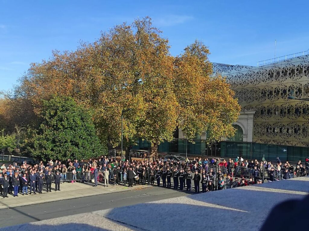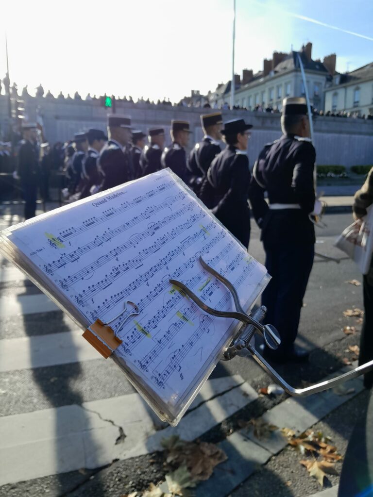 Comme de nombreuses années, l’orchestre a participé à la cérémonie de commémoration de l’Armistice de 1918, qui est aussi la journée nationale de commémoration de la Victoire et de la Paix, et d’hommage à tous les Morts pour la France. A Nantes, cette cérémonie se déroule devant les tables mémoriales. Cette année, nous étions plus de 45 musiciens à participer, le responsable militaire du protocole a eu fort à faire à tous nous placer ! Clément assurait les sonneries à la trompette et Bertrand au tambour. La météo de ce mardi 11 novembre était radieuse, beaucoup de musiciens ont regretté de ne pas avoir mis de lunettes de soleil, les manteaux tombaient ….